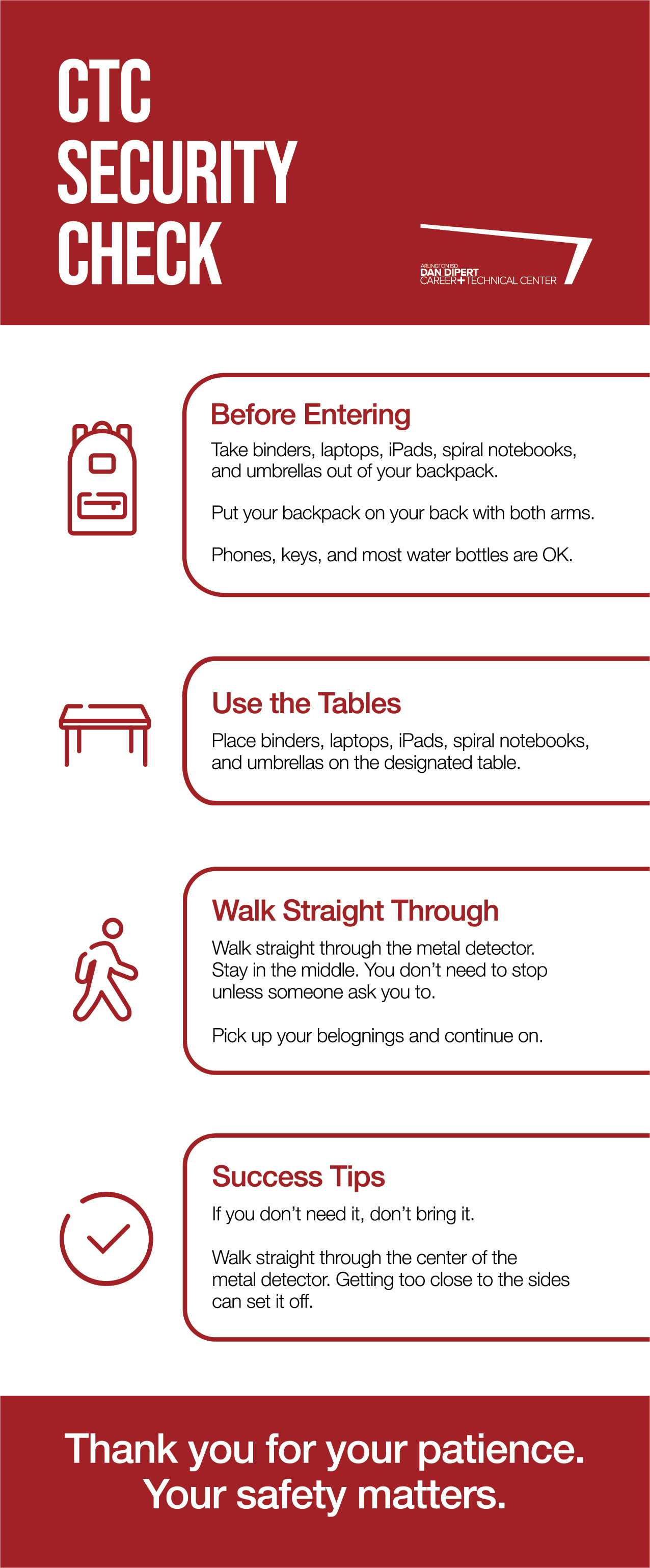 Certainly with privileges come responsibilities. To stay in alignment with the CTC/ASC business/college culture, there are high expectations for student behavior at both campuses. We have visitors in our buildings daily, including the superintendent and central administrators, administrators from other campuses, top officials from our city, community members and visitors from school districts from around the metroplex and state. Therefore, we expect every student to help us greet visitors and make them feel welcome. We expect every student to be an ambassador for the CTC/ASC. There are non-negotiable expectations for behavior of our students. The expectations for every CTC/ASC student are as follows: