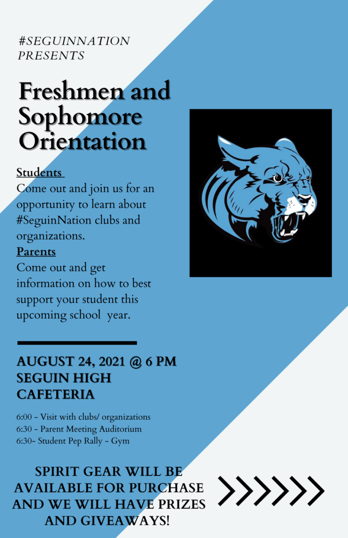 Come out and join us on August 24th @6:00PM in the Seguin High Cafeteria to see all what’s going on campus. This is a great opportunity to see how to best support your child and see what organization’s and clubs Seguin Nation has to offer!